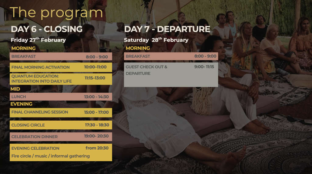 Includes access to the full 7-day retreat program with all retreat meals included (Breakfast, Lunch & Dinner), no on-site accommodation.